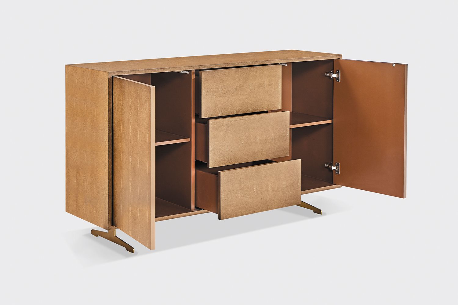 Das KAWOLA Sideboard GALA besticht durch seine elegante Kombination aus modernem Design und praktischer Funktionalität. Der Korpus, die Türen und die Schubladen sind stilvoll mit hochwertigem goldfarbenen Kunstleder bezogen, das dem Möbelstück eine luxuriöse Optik verleiht. Die zwei Türen und drei Schubladen bieten großzügigen Stauraum und lassen sich dank des komfortablen Push-to-Open-Mechanismus mühelos öffnen. Die goldfarbenen Kufenfüße aus gebürstetem Edelstahl sorgen für einen modernen, zeitlosen Look und bieten gleichzeitig stabile Standfestigkeit. Variabel einsetzbare Einlegeböden ermöglichen eine flexible Nutzung des Innenraums und passen sich Ihren Bedürfnissen an. Das Sideboard GALA von KAWOLA fügt sich perfekt in jedes Wohnambiente ein und ist ideal für Liebhaber von schlichten, aber dennoch eleganten Möbelstücken. Entdecken Sie die perfekte Kombination aus Design und Funktionalität mit dem Sideboard GALA!