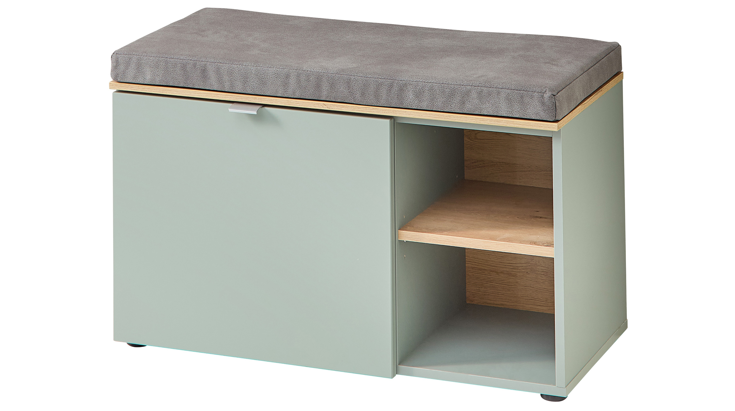 Garderobenbank mit Sitzkissen grün Artisan Eiche – BARIEinladend und ordentlich – mit dem Modell BARI beginnt das Wohlfühlen schon an der Tür!Beim Empfang Ihrer Gäste zählt der erste Eindruck beim Betreten der Wohnung. Unsere Garderobenbank BARI heißt jeden mit Stil willkommen. Die Gestaltung in schilfgrün bringt einen attraktiven Farb-Touch in Ihre Diele. Der zurückhaltente Pastellton harmoniert dabei wunderbar mit den Elementen in Artisan Eiche und lässt ein Gefühl von wohliger Naturnähe entstehen. Als dezente moderne Nuance wurde ein Metallgriff in silber matt angebracht.Auch der Stauraum überzeugt mit einer durchdachten Aufteilung und Ausstattung. Hinter der Tür, erwartet Sie genügend Platz für Ihre Schuhe oder anderes Equipment. Daneben finden Sie 2 offene Fächer für allerlei Wohnutensilien oder dekorativen Accessoires. So bietet der Schrank mit insgesamt 2 Einlegeböden ein ideales Ordnungssystem für Ihren Eingangsbereich. Praktischerweise können Sie die Einlegeböden variabel einsetzen und so an Ihre Bedürfnisse anpassen. Nicht zuletzt darf auch das graue Sitzkissen im Lederlook nicht fehlen, welches ein bequemes Sitzen erlaubt. Als Krönung dieses unschlagbaren Angebots verfügt die Tür über eine Soft-Close-Funktion, womit das Material geschont und ein leises Schließen ermöglicht wird.Bestellen Sie noch heute online Ihre neue Garderobenbank oder besuchen Sie uns an einem unserer Standorte.Wir freuen uns auf Sie!