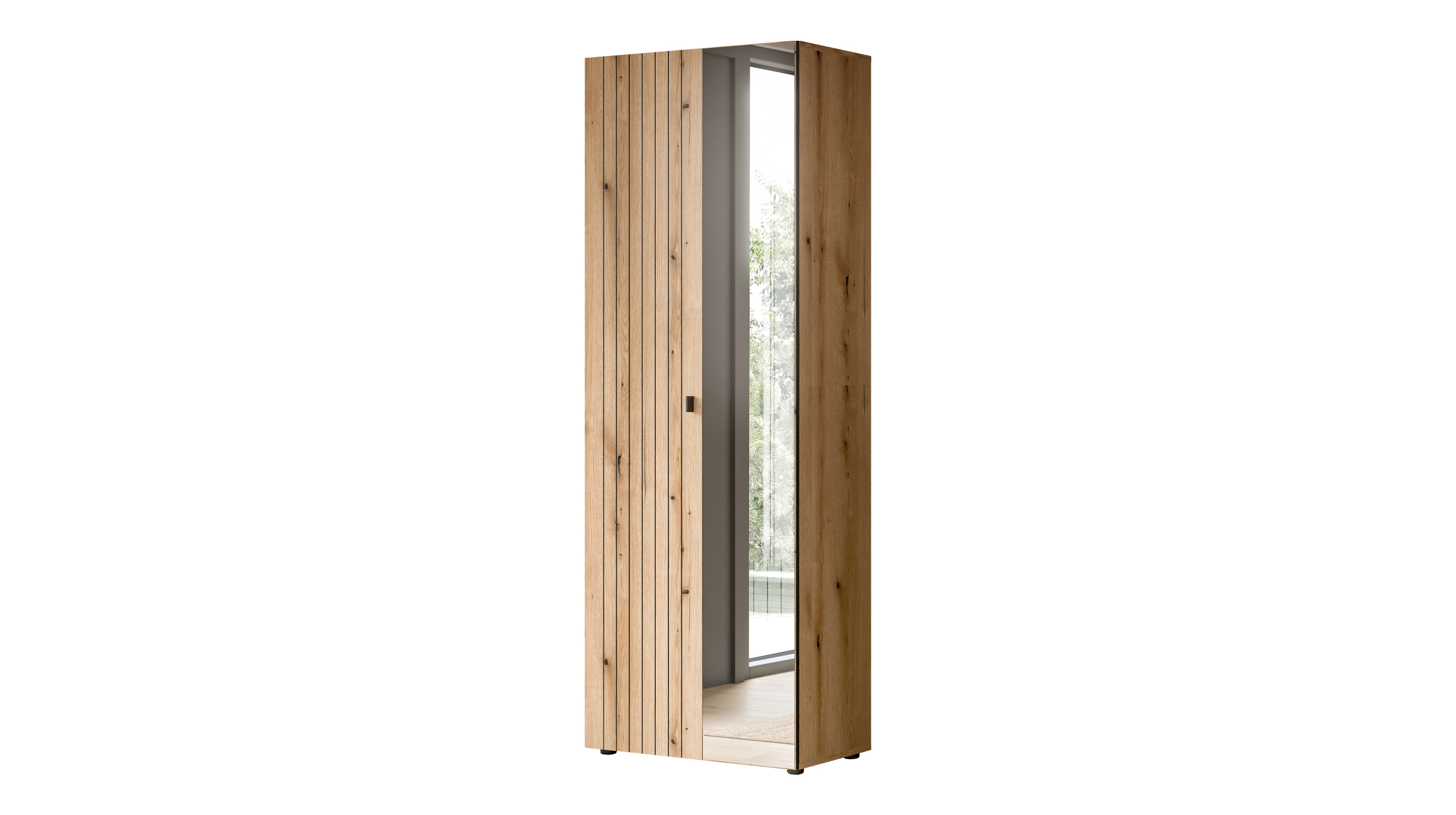 Garderobenschrank Evoke Eiche – mit Kleiderstange – STATIONZuhause ankommen und wohlfühlen – mit unserem Garderobenschrank STATION!Ihr Zuhause erwartet Sie dank STATION mit einem einladenden Ambiente, in dem Sie sich schon beim Eintreten wohlfühlen. Die Evoke Eiche Nachbildung mit ihrer warmen, natürlichen Holzoptik wird durch die raffinierte Akustikpaneel-Optik noch zusätzlich aufgewertet und erzielt durch letztere ein besonders modernes Erscheinungsbild. So fügt sich der Garderobenschrank mühelos sowohl in klassische, als auch zeitgemäße Einrichtungen ein und zieht dabei immer alle Blicke auf sich. Der elegante schwarze Griff aus Metall stellt einen kühlen Kontrast zur warmen Holzoptik dar und vollendet das elegante Design des Garderobenschranks STATION.Dank der großen Spiegeltür können Sie nicht nur einen schnellen Blick auf Ihr Outfit werfen, bevor Sie das Haus verlassen. Der Spiegel vergrößert auch optisch den Raum und lässt selbst kleine Eingangsbereiche geräumiger und heller erscheinen. 2 Drehtüren verbergen gut organisierten Stauraum für Ihre Garderobe. Auf 1 ausziehbaren Kleiderstange können Jacken, Schals oder Mänteln knitterfrei aufgehängt werden. Handtaschen, Hüte, Schuhe oder Accessoires finden ordentlich verteilt auf 1 Konstruktionsboden und 4 verstellbaren Einlegeböden ausreichend Platz. Kommen Sie Zuhause an – mit unserem Garderobenschrank STATION.Bestellen Sie Ihren neuen Garderobenschrank noch heute über unseren Onlineshop. Wir freuen uns auf Sie!
