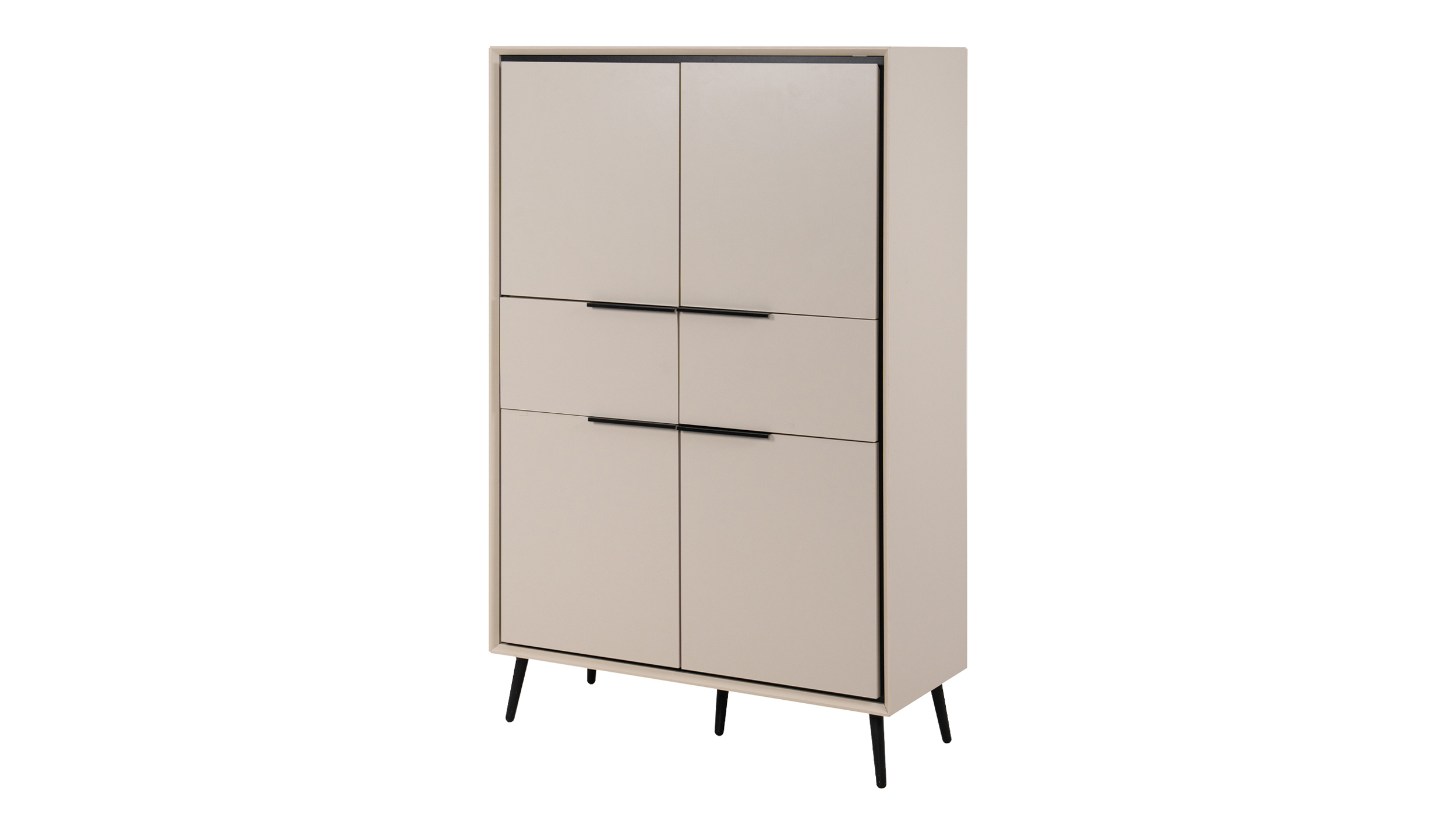 Highboard beige schwarz 4 Türen 2 Schubladen – ARONAStauraum mit Stil – das Highboard ARONA!Das Highboard ARONA in Sand, einem beigen Farbton, verleiht Ihrem Zuhause eine warme, gemütliche Atmosphäre. Gleichzeitig wirkt das Möbelstück mit seinem geradlinigen Design und der schwarzen Schattenfuge modern und elegant. Während die beiden unteren Türen und die beiden Schubladen mit schwarzen Griffleisten aus Metall ausgestattet sind, besitzen die beiden oberen Türen eine praktische Schrägkante und können so grifflos geöffnet werden. Dieses kleine Detail verstärkt das minimalistische Design des Möbelstücks auf ästhetische Art und Weise. Die schwarzen Füße haben eine Höhe von ca. 16 cm und eigenen sich so ideal für den Einsatz eines Saugroboters. Sie bringen zusätzliche Leichtigkeit ins Design und unterstreichen das moderne, stillvolle Äußere des Highboards.Mit kompakten Maßen von ca. 90 cm Breite und ca. 38 cm Tiefe passt das Highboard in jeden Raum und bietet auf einer Höhe von ca. 140 cm dennoch jede Menge Stauraum. Hinter 4 praktischen Drehtüren ermöglichen 4 Einlegeböden flexible, vielseitige Aufbewahrungsmöglichkeiten, von Blumenvasen, über Geschirr bis hin zu Dokumenten oder Aktenordnern. 2 geräumige Schubladen bieten Platz für kleinere Alltagsgegenstände, die Sie schnell zur Hand haben möchten, wie Besteck, oder Tischdecken. Die Soft-Close-Funktion sorgt dafür, dass die Türen angenehm leise und sanft schließen – ein kleines Detail mit großer Wirkung, das Ihren Alltag spürbar angenehmer macht und das Möbelstück auch bei täglicher Nutzung schont. Ob als zusätzlicher Stauraum oder edler Blickfang, das Highboard ARONA bringt modernes Design und durchdachte Funktionalität in perfekten Einklang – für alle, die ihr Zuhause schöner gestalten möchten.Entdecken Sie das Highboard ARONA und bestellen Sie gleich online. Wir freuen uns auf Sie!