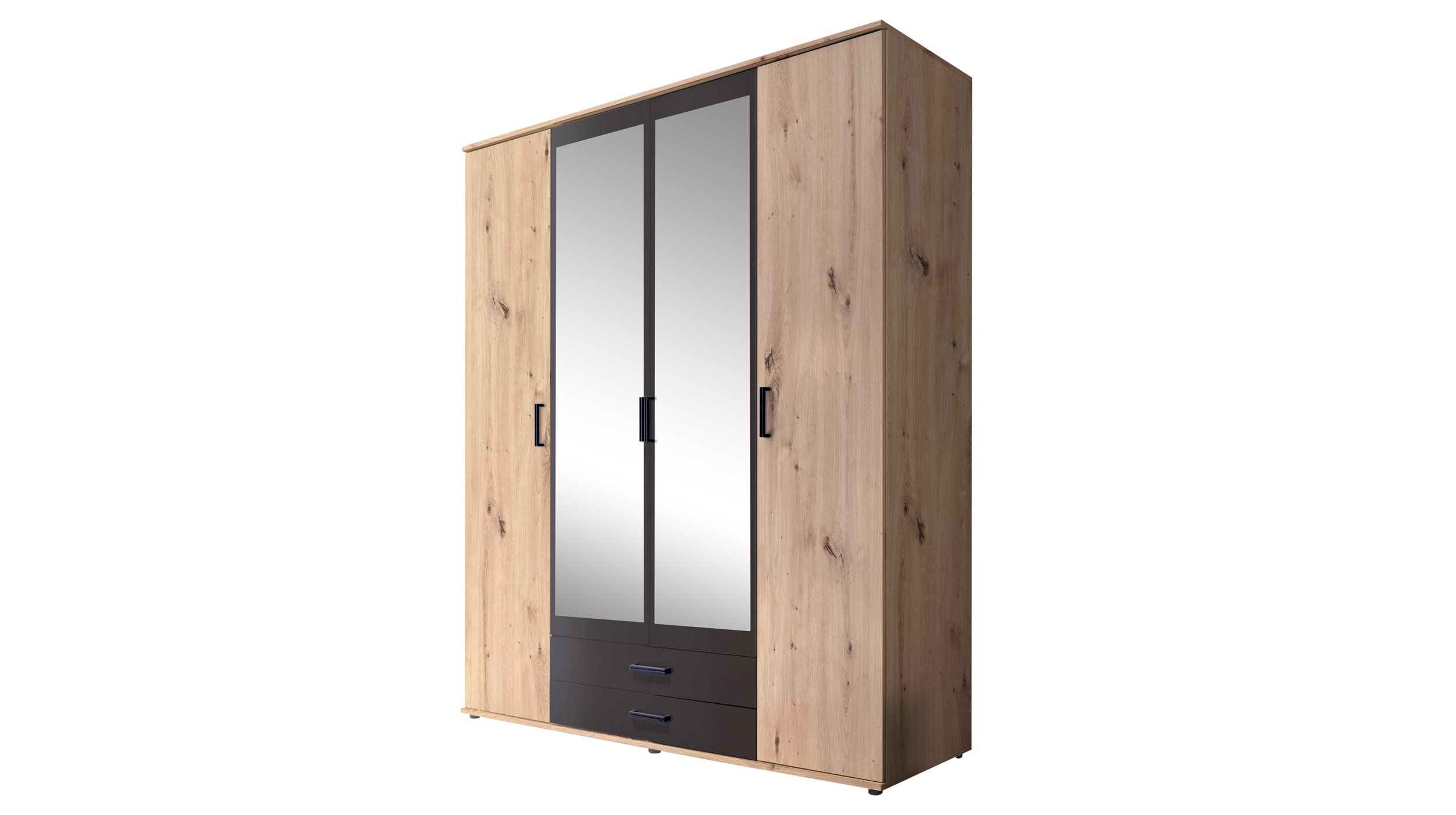 Kleiderschrank – Artisan Eiche – Spiegel – 160 cm – CHICAGOUnser Kleiderschrank CHICAGO im Überblick:Stellmaß: ca. B 160 cm x H 197 cm x T 54 cmFarbe Fronten: anthrazit und holzfarbenFarbe Korpus: holzfarbenHolzdekor: Artisan EicheTüren: inkl. 2 Drehtüren und 2 SpiegeltürenSchubladen: inkl. 2 SchubladenInnenausstattung: inkl. 7 Einlegeböden und 1 KleiderstangeSchwarze GriffeMit unserem Kleiderschrank der Reihe CHICAGO erhalten Sie ein preisgünstiges Angebot mit allen Vorteilen eines großzügigen Kleiderschrankes. Das wärmende Artisan Eiche Dekor besticht vor allem durch die Nachbildung von Astlöcher und einer natürlichen Maserung im rustikalen Stil. Die Kombination mit Absetzungen in der Farbe anthrazit und mit schwarzen Griffen vollenden das Erscheinungsbild des Drehtürenschrankes CHICAGO.Damit Sie Ihre Kleidung fachgerecht und ordentlich verstauen können, finden sich hinter den Drehtüren insgesamt 7 Einlegeböden, welche zum Einsortieren Ihrer Jeans, Shirts und Pullover dienen. Hinter den 2 Spiegeltüren verbirgt sich eine praktische Kleiderstange. Hier können Sie Ihre Sommerkleider, Hemden und Co. knitterfrei auf Kleiderbügel aufhängen. Für weiteren Stauraum sorgen 2 Schubkästen – Hier findet Ihre Unterwäsche den passenden Platz. Die bereits angebrachten Spiegel sichern den finalen Style-Check vor dem Verlassen des Hauses.Überzeugen Sie sich selbst von unserem Angebot an Drehtüren- und Schwebetürenschränken.