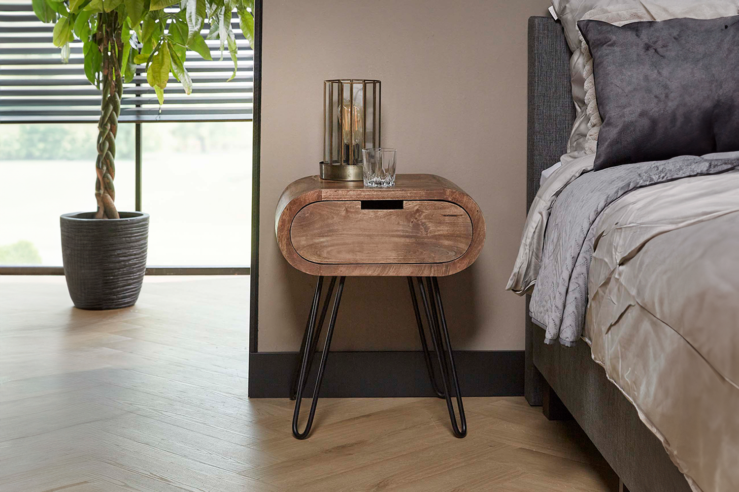 Der KAWOLA Nachttisch BAEL überzeugt mit trendigem Design und hochwertiger Verarbeitung. Gefertigt aus nachhaltigem Mangoholz mit sandfarbenem Finish und kombiniert mit einem schwarzen, pulverbeschichteten Metallrahmen, bringt er natürlichen Charme und moderne Eleganz in Ihr Schlafzimmer. Die runde Form sorgt für einen weichen, stilvollen Look und macht den Tisch zu einem echten Hingucker. Eine praktische Schublade bietet Stauraum für persönliche Dinge wie Bücher, Brillen oder Ladegeräte. Mit seinen Maßen von 50 x 35 x 60 cm ist BAEL vielseitig einsetzbar – als Nachttisch, Beistelltisch oder stilvolle Ablage. Der Nachttisch BAEL verbindet Funktionalität mit außergewöhnlichem Design und ist ideal für moderne Wohnkonzepte.