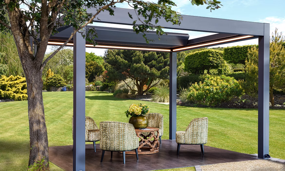 Mit den Pinela Deluxe Lamellendächern von Deponti können Sie zu jeder Zeit wetterunabhängig ein angenehmes Outdoor-Feeling genießen. Per Knopfdruck lassen sich die Lamellen nach Belieben verschieben, wodurch bei Bedarf ein völlig offener Raum erschaffen werden kann.