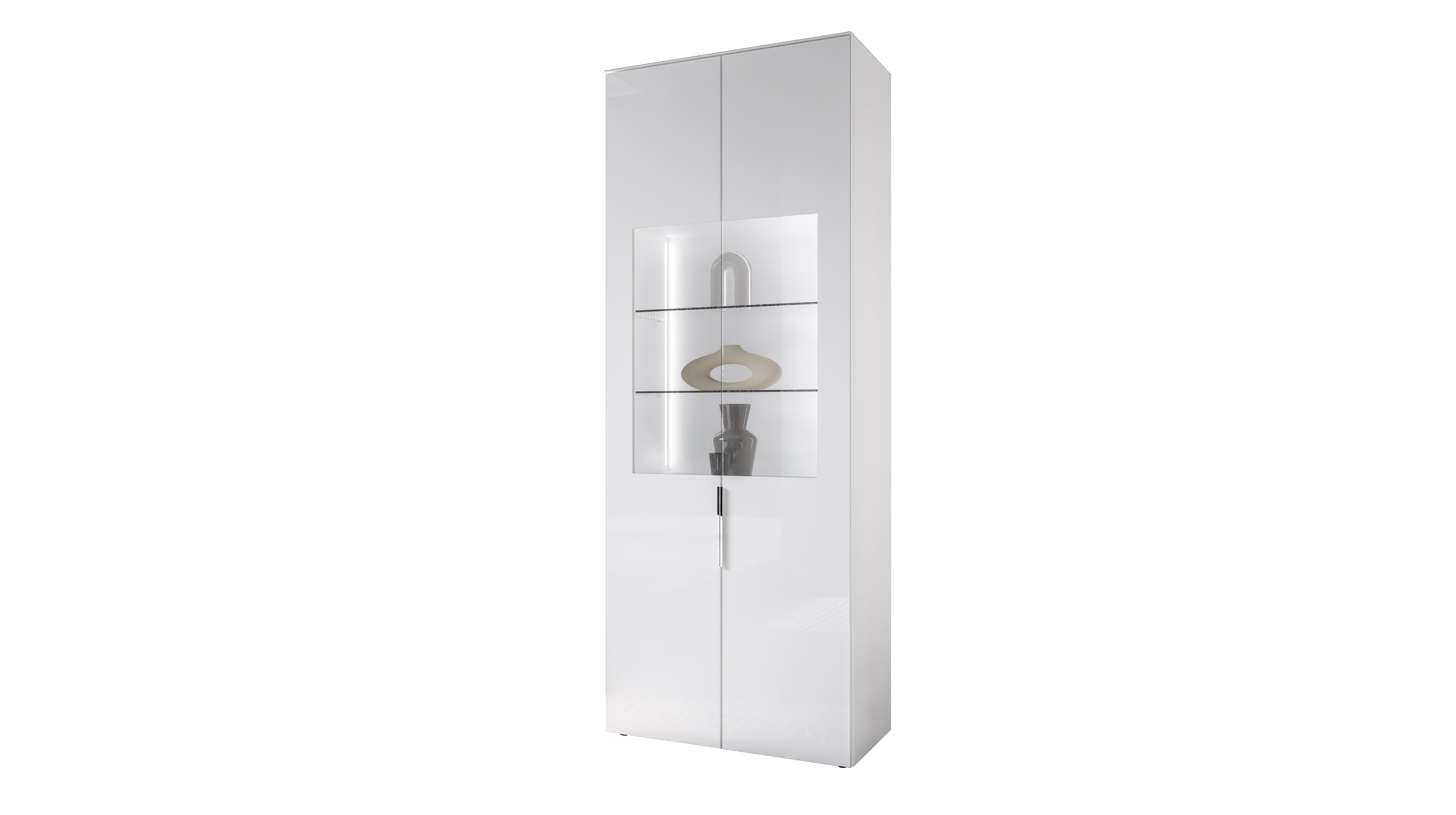 Vitrine mit Glastür weiß Glas 75 cm – Metallgriffe – SANTORINVerleihen Sie Ihrem Raum Glanz und Struktur mit unserer Vitrine SANTORIN!Das elegante und zeitlose Erscheinungsbild unserer Vitrine SANTORIN zieht unweigerlich alle Blicke auf sich. In einem makellosen Weiß gehalten und mit einer edlen Glasfront versehen, fügt sich das Möbel harmonisch in jede Einrichtung ein. Die glänzenden chromfarbigen Metallgriffe setzen dezente, aber wirkungsvolle Akzente und verleihen dem Möbelstück einen Hauch von Luxus. Das moderne Design wird von den Glastüren vervollständigt. Sie bieten einen Einblick in das Innere der Vitrine, der geradezu einlädt, besondere Gegenstände dekorativ in Szene zu setzen. Ob eine Vase mit frischen Blumen, ein paar stilvolle Kerzenhalter oder eine Sammlung von Fotos – die integrierte Beleuchtung bringt alles perfekt zur Geltung.Mit einer Breite von ca. 75 cm und einer Höhe von ca. 197 cm bietet die Vitrine großzügigen Stauraum. Geschirr, Ordner oder Dekoration finden hinter den 2 Drehtüren den idealen Platz. So haben Sie auf 3 Einlegeböden und 2 Glasböden verteilt immer alles geordnet untergebracht. Dank des cleveren Designs ist alles griffbereit und dennoch blickdicht verstaut. Die Soft-Close-Technologie sorgt dafür, dass die beiden Türen sanft und leise schließen und macht die tägliche Verwendung der Vitrine besonders komfortabel. Nutzen Sie unsere stilvolle Vitrine SANTORIN zur Aufbewahrung von Gläsern, als elegantes Bücherregal oder zur Präsentation Ihrer Lieblingsdekoration und genießen Sie die perfekte Kombination aus Design und Funktionalität.Bestellen Sie Ihre neue Vitrine noch heute online. Wir freuen uns auf Sie!